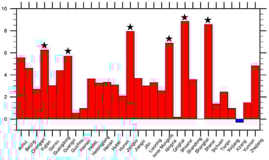 The residual NDVI trends (10−2) at the provincial scale. The asterisk indicates a statistical significance at the 0.01 level.