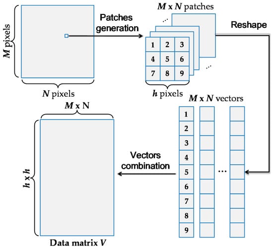 After obtaining the difference image, the next step is to extract features by using Deep Semi-NMF. Neighborhood patches of the size pixels around each pixel are extracted and these patches are rearranged as column vectors. Then, the column vectors for all the pixels are combined to form a data matrix . The process of data matrix generation is illustrated in Figure 2.