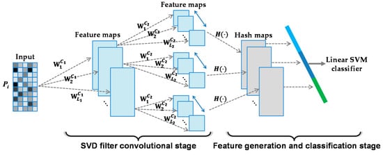 The structure of SVD networks is shown in Figure 3. In the SVD filter convolutional stage, we use two convolutional layers. In the feature generation and classification stage, hash coding and linear SVM classifier are utilized. In the next subsections, we will give a detailed introduction of the two stages of SVD networks.