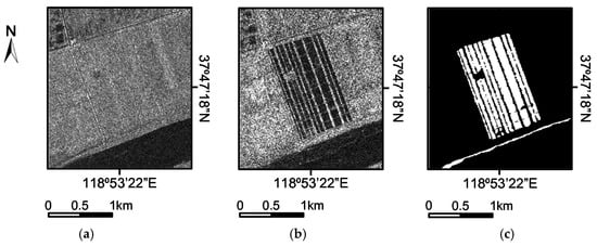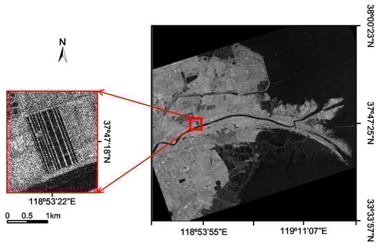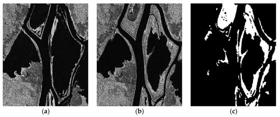 The first dataset is the Yellow River dataset. It presents a section of SAR images acquired by Radarsat-2 at the region of the Yellow River Estuary in China. The original SAR image is shown in Figure 5. We select one representative area of size 257289 for change detection. The image acquired in 2008 is shown in Figure 6a, while the image acquired in 2009 is shown in Figure 6b. The ground truth change map is shown in Figure 6c, and it was generated by on-the-spot investigation and expert knowledge. It should be noted that the two images are a single-look image and a four-look image. Therefore, the influence of speckle noise in the dataset is much greater than the other datasets.