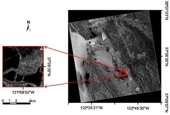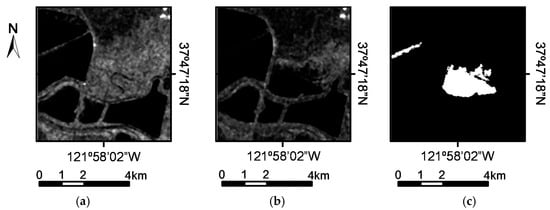 The second dataset is the San Francisco dataset. It presents a section (256256 pixels) of two SAR images acquired by the ERS-2 SAR sensor over the city of San Francisco. The original images are 77497713 pixels, as shown in Figure 7. The images are provided by the European Space Agency. The image captured in August 2003 is shown in Figure 8a, and the image captured in May 2004 is shown in Figure 8b. The ground truth change map is shown in Figure 8c, and it was generated by integrating prior information with photo interpretation.
