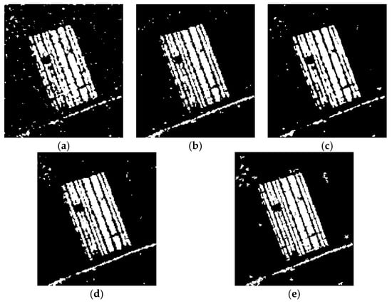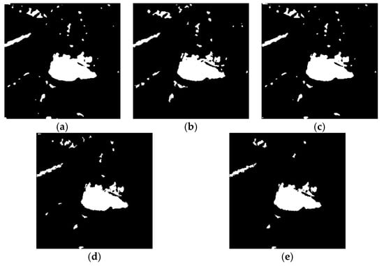 Change detection results generated by different methods on the Ottawa dataset. (a) Result by PCAKM. (b) Result by MRFFCM. (c) Result by GaborTLC. (d) Result by D_MRFFCM. (e) Result by the proposed method.