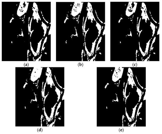 Change detection results generated by different methods on the Yellow River dataset. (a) Result by PCAKM. (b) Result by MRFFCM. (c) Result by GaborTLC. (d) Result by D_MRFFCM. (e) Result by the proposed method.