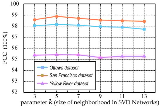 The ideal parameter for change detection should be selected before verifying the effectiveness of the proposed method. In SVD networks, the size of the sample image patch is an important parameter, since the local information is sensitive to neighborhood noise. Therefore, the first experiment is a test of parameter , which denotes the size of the sample image patch from each input SAR image. We evaluate the performance of change detection by taking 3, 5, 7, 9, 11, and 13, respectively. The PCC value is exploited as the validation criterion on different datasets. Figure 13 shows the sensitivity analysis results of the sample image patch size . The curves in different colors denote the results on different datasets.
