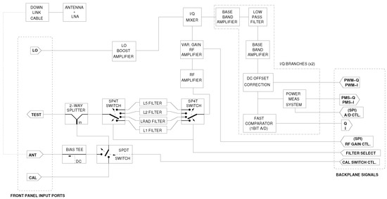 | Band select | Selects the corresponding RF filter from the filter bank of the receivers and the appropriate VCO (Voltage-Controlled Oscillator) at the synthesizer board. |