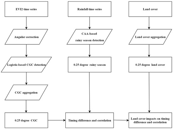 A diagram illustrating the procedures for analyzing canopy greenness cycle, rainfall seasonality, and land cover impacts. EVI2: Two-band Enhanced Vegetation Index, CGC: Canopy greenness cycle, CAA: Climatological anomalous accumulation.