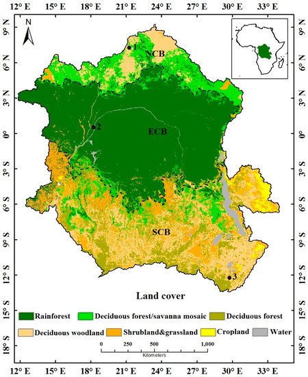 We divided the Congo Basin into three sub-basins based on dominant land cover, to better characterize LSP and rainfall seasonality across different ecosystems (more details available in Section 3.1. The northern Congo Basin (NCB) (3°N–9°N) is dominated by deciduous woodland, and a mosaic of deciduous forest and savanna. The equatorial Congo Basin (ECB) (6°N–6°S) is primarily occupied by tropical rainforest. The southern Congo Basin (SCB) (0°–12°S) is covered by grassland, shrubland, deciduous woodland, and deciduous forest. Details of the land cover product used in this study are presented in Section 3.1.