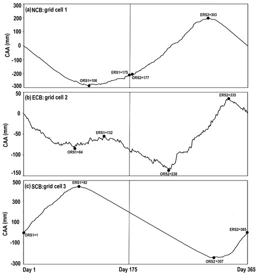 To determine ORS and ERS for a given year, the climatological ORS and ERS were first determined based on the following steps [19]. (1) For each day of a year, the daily average rainfall was calculated using rainfall on the same day but in different years during 1998–2013. (2) The annual-mean rainfall was calculated as the mean value across the daily average rainfall time series. (3) The climatological anomalous rainfall for each day was determined by deducting the annual-mean rainfall from the daily average rainfall. The CAA time series was then generated by accumulating the climatological anomalous rainfall across the year. (4) Since the CAA method was originally designed to detect the rainy season in regions with a unimodal rainfall regime, we modified the CAA method to accommodate the bimodal rainfall regime in ECB. The original CAA method determines the climatological ORS and ERS as the first day after the minimum and maximum CAA, respectively [19]. Based on an exhaustive visual examination of the CAA time series extracted from individual grid cells in ECB, we found that the two rainy seasons could be separated using day 175. We therefore modified the CAA method by first dividing the CAA time series into two sections: day 1–175 and day 176–365 (Figure 3). For each section, we first identified all the days corresponding to a local CAA minimum. We then determined ORS as the first day after the local minimum that has the lowest CAA within this section. ERS was thereafter determined as the first day after the maximum CAA between ORS and the last day of this section. As a result, there were two potential ORS and ERS for each 0.25° grid cell (Figure 3). (5) To determine the rainfall regime for a grid cell, we calculated the number of days during the two potential dry seasons: ERS1 to ORS2 and ERS2 to ORS1. Our premise was that if a given grid cell has a bimodal regime, it must have two relatively long dry seasons such as in Figure 3b. A unimodal regime can be determined if one potential dry season is long, whereas the other one is short, such as in Figure 3a,c. (6) Based on all the 0.25° grid cells in ECB, we generated two dry season length thresholds, which were the average number of days from ERS1 to ORS2 and from ERS2 to ORS1. (7) Finally, if the duration of both potential dry seasons were longer than the corresponding threshold, a bimodal rainfall regime was determined, and the two potential ORS and ERS were employed as the climatological ORS and ERS, respectively. If the duration of one potential dry season was shorter than the corresponding threshold, a unimodal rainfall regime was determined. The potential ORS and ERS associated with this short dry season were ignored. The remaining ORS and ERS were used as the climatological ORS and ERS.
