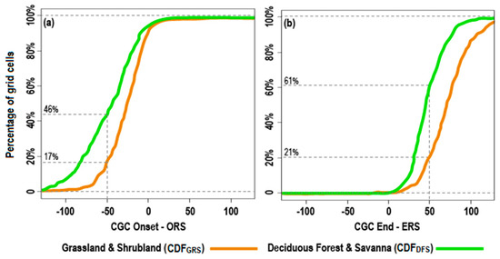 A comparison of the cumulative distribution function for CGC onset lead time (a) and CGC end lag time (b) between grassland and shrubland (GRS) and deciduous forest and savanna mosaic (DFS) land cover groups. The Y-axis represents the percentage of grid cells. The X-axis in (a) represents the number of days that CGC onset precedes ORS, whereas the X-axis in (b) indicates the number of days that CGC end lags behind ERS.