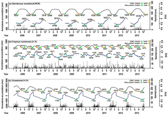 Inter-annual variations in the rainy season and CGC timing at the deciduous woodland grid cell in NCB (a), the rainforest grid cell in ECB (b) and the grassland grid cell in SCB (c). Black and blue lines represent the reconstructed EVI2 temporal trajectory and the anomalous rainfall accumulation, respectively. Daily rainfall is shown as black bars. Green and orange triangles represent CGC onset and end, respectively. Green and orange circles represent the rainy season onset and end, respectively. The onset and end dates are labeled next to the corresponding symbols using a MM/DD format. The left Y-axis indicates anomalous rainfall accumulation. The first Y-axis on the right represents daily rainfall, whereas the second Y-axis displays EVI2.