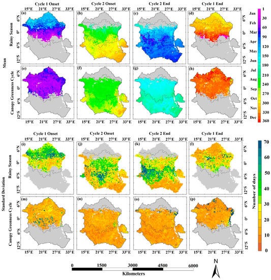 The mean value and standard deviation of the rainy season and CGC timings during 2006–2013 across the Congo Basin. Mean value of rainy season timing (a–d); mean value of CGC timings (e–h); standard deviation of the rainy season timing (i–l); standard deviation of CGC timing (m–p). Note that for areas with two rainy seasons (or CGCs) in ECB, the first rainy season and CGC begin in the first cycle ((a) and (e)) and end in the second cycle ((c) and (g)), whereas the second rainy season and CGC begin in the second cycle ((b) and (f)) and end in the first cycle ((d) and (h)). The gray area indicates that the specific rainy season or CGC metric was detected less than four times during 2006–2013.