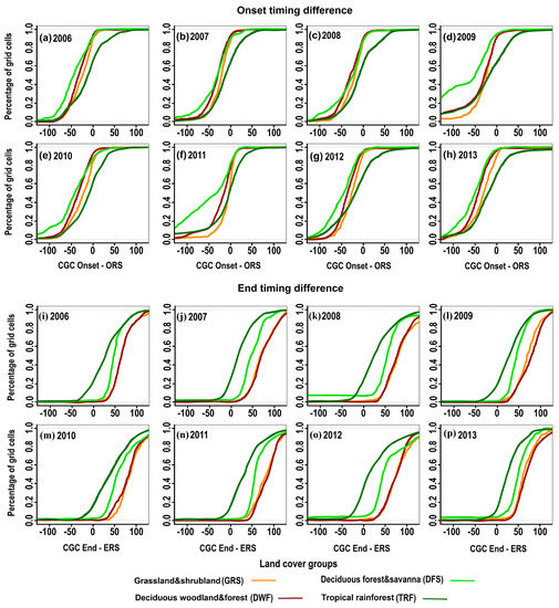 We further examined the variation in the timing difference between CGC and the rainy season across the four land cover groups described in Section 3.1 in each year during 2006–2013. For any given year, this was done by comparing the cumulative distribution function (CDF) of the timing difference extracted from the 0.25° grid cells of any two land cover groups. In order to determine if the CDF of CGC onset lead time (i.e., CGC onset–ORS) from two land cover groups was significantly different, we conducted a one-tailed two-sample Kolmogorov-Smirnov test using the R package “dgof” [38]. Taking the Kolmogorov-Smirnov test between the CDF of CGC onset lead time from grassland and shrubland (GRS) and that from deciduous forest and savanna mosaic (DFS) as an example (i.e., CDFGRS and CDFDFS) (Figure 4a), the null hypothesis was that CDFDFS is larger than or equal to CDFGRS. By rejecting the null hypothesis, the alternative hypothesis is accepted that CDFDFS is smaller than CDFGRS, which means that CDFDFS stays above and to the left of CDFGRS. For example, in Figure 4a, the number of grid cells with a CGC onset lead time less than −50 (i.e., CGC onset occurs 50 days or more prior to ORS) accounted for 17% of the grid cells from GRS, whereas it accounted for as much as 46% from DFS. In other words, CGC onset in DFS preceded ORS by a larger number of days than CGC onset did in GRS, which made CDFDFS “numerically” smaller than CDFGRS. This analysis was repeated to investigate the impacts of land cover on CGC end lag time relative to ERS (i.e., CGC end−ERS). In Figure 4b, for example, the number of grid cells with a CGC lag time less than 50 (i.e., CGC end lags behind ERS for 50 days or less) only accounted for 21% of the grid cells in GRS whereas it accounted for as much as 61% of the grid cells in DFS. This indicates that the grid cells with a shorter lag time had a higher percentage in DFS than it did in GRS. Therefore, CDFDFS is “numerically” smaller than CDFGRS.