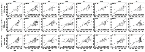 Regression between spatial variation in ORS and CGC onset during 2006–2013 for grassland & shrubland (the top row), deciduous woodland (the middle row) and deciduous forest (the bottom row). X-axis represents ORS, whereas Y-axis represent CGC onset. The number of samples (N) used in each regression analysis is indicated at the upper left corner of a panel, whereas the R-squared value (R2) and residual standard error (RSE) are indicated at the lower right corner. The solid black lines represent the fitted regression lines, whereas the dashed black lines represent the 1:1 lines. Lighter shade indicates higher point density. The regressions shown in this figure are all significant at p < 0.001