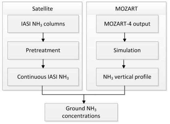 In comparison with CTM simulations, satellite remote sensing is considered as an observational perspective and offers another way to obtain large-scale NH3 columns with high spatial resolutions, based on advanced infrared spectroscopy (IR) sounders, such as the Infrared Atmospheric Sounding Interferometer (IASI), the Tropospheric Emission Spectrometer (TES), and the Cross-track Infrared Sounder (CrIS) [26,27]. Large-scale distributions of IASI NH3 columns could denote the status of NH3 levels in regions not covered by ground measurement networks, expanding insight into new NH3 sources including industry, agriculture, and biomass burning [2,22]. However, satellite NH3 can only provide the columns and has no information of the vertical distributions of the columns (from the ground to the top of the atmosphere), presenting a barrier in obtaining the ground NH3 concentrations. Fortunately, as mentioned in the last paragraph, the detailed NH3 profiles could be obtained from CTMs. Combining the advantages of CTMs (NH3 profiles) and satellite observations (large-scale overages with high spatiotemporal resolutions), the ground NH3 concentrations can be derived.