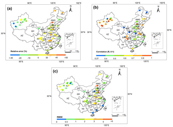 Spatial distribution of the relative error (a), correlation (b) and root-mean-square error (RMSE) (c) of the estimated ground NH3 concentration (µg N m−3) at 44 NNDMN sites.
