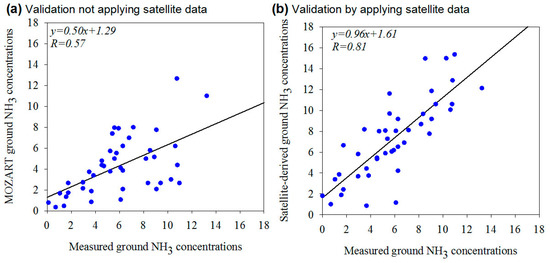 Yearly comparisons between the estimated and measured ground NH3 concentration (µg N m−3). (a) indicates the comparison between the measured ground NH3 concentrations and the estimated ground NH3 concentrations from MOZART at the lowest layer before applying the satellite data, while (b) represents the comparison between the measured and estimated ground NH3 concentrations by applying the satellite data using the methods in Section 2.4.
