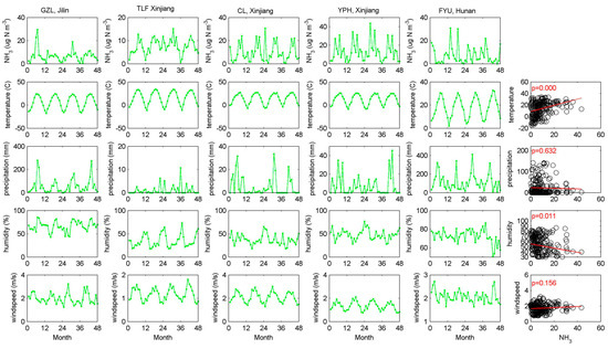 The seasonal variations of ground NH3 concentrations (µg N m−3), temperature (°C), precipitation (mm), humidity (%), and wind speed (m/s) at five sites with best-simulated ground NH3 concentrations from January 2010 to December 2013 (0–12, 2010; 13–24, 2011; 25–36, 2012; 37–48, 2013). The relationship between the ground NH3 concentrations and precipitation (mm), humidity (%), and wind speed (m/s) at each site is provided in Figure A4, Figure A5, Figure A6, Figure A7 and Figure A8.