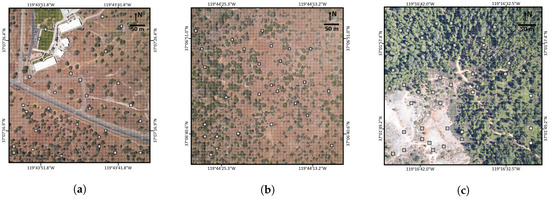 Overhead imagery of the three remote sensing scenes validated in this paper: (a) SJER High School; (b) SJER 116; and (c) SOAP 299. A generic 10 m×10 m grid is overlaid on the RGB photographs, showing the size of validation sampling plots. Randomly selected sampling plots are marked.