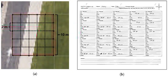 In order to more accurately estimate plot level abundances, a rope grid was positioned on top of the 10 m×10 m plot, dividing the plot into 25 2 m×2 m samples. This is illustrated in Figure 4a. With the grid in place, the two observers independently estimated the abundance of ground cover classes in each of the 2 m×2 m samples. If the observers’ estimates differed by more than 15% cover area for a given class, the sample was re-examined by both researchers to reduce errors. Estimates were recorded on data collection sheets, as shown in Figure 4b. In addition to abundance estimates for each 2 m×2 m sample, photos were captured showing the entire plot, near nadir photos were captured of each 2 m×2 m sample, GPS coordinates of plot center locations were measured, and a library of spectral samples was compiled using a Spectra Vista Corporation (SVC) field portable spectrometer. Paper data collection sheets and other data were compiled and recorded in a spreadsheet each evening so that errors and ambiguities could be resolved before forgetting important information.