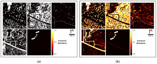 Figure 6 shows an example of fine-scale abundances generated using ED and NNLS. Both results are presented in abundance map format, even though ED assigns whole pixels to one class or another. For this reason, ED abundance maps are black and white, representing 0 (0%) or 1 (100%) coverage, while NNLS abundance maps have values ranging continuously from 0 to 1.