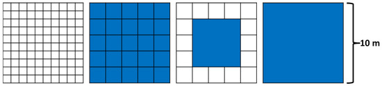 An illustration of how fine-scale samples were aggregated to produce coarse scale samples (left-to-right): 100 unaggregated 1-m samples within a 10 m×10 m plot, 1-m samples aggregated to the 2-m scale, 1-m and 2-m samples aggregated to the 6-m scale, 1-m and 2-m samples aggregated to the 10-m scale.