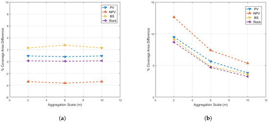 (a) Mean and (b) standard deviation of differences between Field-A and Field-B data for PV, NPV, BS and rock for 2-m, 6-m and 10-m aggregation scales (Field-A data − Field-B data).