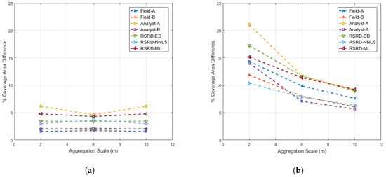 Both plots in Figure 11 are scaled from 0 to 25% coverage area to emphasize that mean differences from MOA (histogram distribution center locations) were relatively small compared to standard deviation differences. Examination of Figure 11b suggests that Field-B, Analyst-B and RSRD-NNLS reference data estimates were more precise than Field-A, Analyst-A, RSRD-ED and RSRD-ML.
