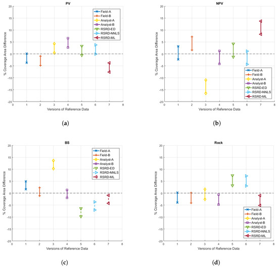 The ideal confidence interval result would be narrow intervals centered on zero. Our results showed that the accuracy of reference data versions varied considerably across classes, e.g., Analyst-A data were the best version of reference data for rock, but were the worst version for NPV and BS. Among RSRD versions, RSRD-NNLS had the overall tightest zone of equivalence, with RSRD-ED a close second. Tabulated confidence interval data and the resulting equivalence zone are provided for RSRD-NNLS data in Table 4. Note that the overall equivalence zone is simply the extent of extreme lower and upper CI values.