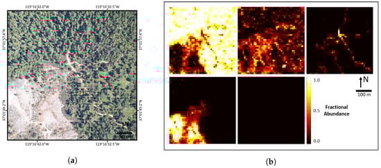 (a) RGB imagery of SOAP299; (b) validated abundance map reference data (AMRD) at the 10 m×10 m aggregation scale for SOAP299, with ground cover classes (left-to-right and top-to-bottom): PV, NPV, BS, rock and other.