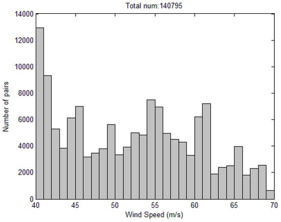 152 hurricanes observations were collected from the TRMM PR between 2008 and 2013, which were collocated with SFMR measurements. The temporal and spatial intervals for collocations were 30 min and 50 km, respectively. For each collocated data pair (denoting 1 s of SFMR data and one incidence angle of PR), the wind speed and rain rate from SFMR and the NRCS from the PR were recorded. The collocated dataset contains 29,798,600 points, of which 87.22% and 58.11% are below 5 mm/h and 2 mm/h, respectively. Only 140,795 points correspond to wind speeds above 40 m/s. The distribution of the wind speeds between 40 m/s and 70 m/s is shown in Figure 1. The numbers in each of the wind speed bin do not have large discrepancies among one another.