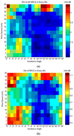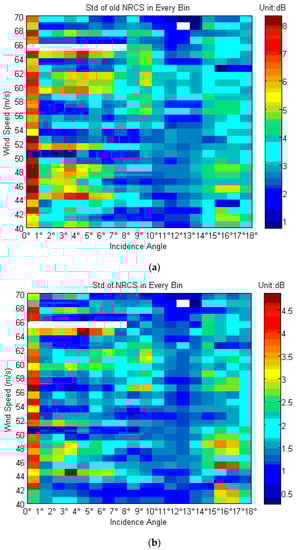Typically, strong winds in intense storms bring intense rainfall. To reduce the rain impacts on the NRCS and obtain sufficient data pairs for our analysis at extremely high winds, we selected pairs with rain rates below 5 mm/h. These pairs are gridded by discretizing the wind speeds and incidence angles into 1 m/s bins and 1° bins, respectively. In the two-dimensional bins, data pairs whose NRCS deviates by more than one standard deviation (STD) from the NRCS average are discarded. This simple quality control criterion yields a new NRCS. Figure 2 and Figure 3 show the STD distributions of the old and new NRCSs, respectively. Panels a and b of each figure display the binned STDs in the wind speed ranges 6–20 m/s and 40–70 m/s, respectively.