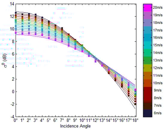 Figure 5 shows the dependence of NRCS on wind speed, analyzed with the same dataset as Figure 4. The NRCSs destabilize at near-nadir angles (as evidenced from the STDs in Figure 2b), and the discrepancy increases at 18°. However, the differences between the measured NRCSs and those simulated with the geometrical optics model [25] are less than 1 dB. Therefore, the results are considered to be consistent (given the 1 dB uncertainty in PR) [24].