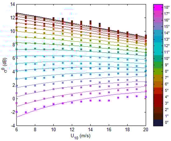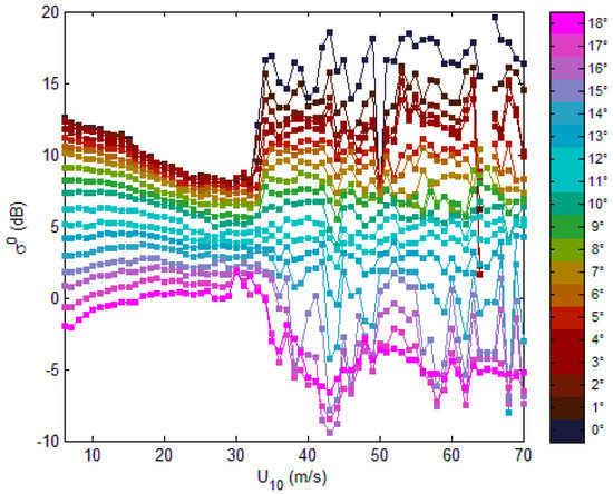 In previous studies, the levels off at 32–33 m/s; in others, saturation occurs at 22–23 m/s [33]. Figure 7 is consistent with saturation at 32–33 m/s; otherwise, the NRCS should begin dramatically varying at 22–23 m/s. Besides validating the remote sensing data, the new characteristics may potentially assist anticipated satellites missions in the future.
