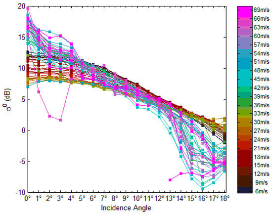 NRCS analyses at low incidence angles and low wind conditions have been frequently reported [15,16,17,18]. Some researchers consider that the NRCS under high wind conditions can be extrapolated from the NRCS characteristics in moderate wind conditions [19,20,21]. At high winds (up to 35 m/s), Quilfen et al. [22] empirically derived an inverse relationship between the sea surface roughness and altimeter backscatter. However, at wind speeds exceeding 35 m/s, the collocated data are too sparse to analyze the characteristics with statistical confidence.