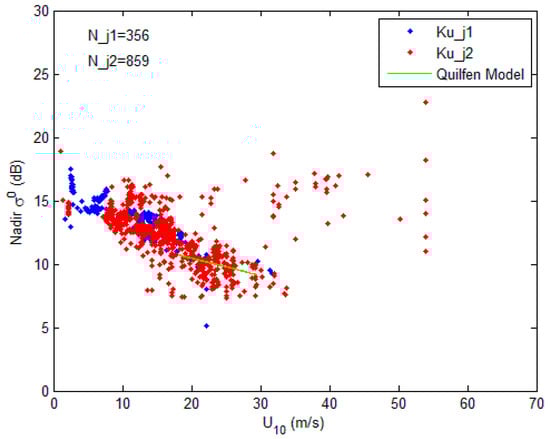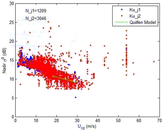 To determine whether the altimeter NRCS data yield similar results or not, we plot the dependence of NRCS acquired by Jason-1 and 2 on wind speed. The results are shown in Figure 8. Here, the wind speeds are also collocated from SFMR. The model of Quilfen [22] is also illustrated for comparison. The model coefficients were derived by orthogonal regression between the QuikSCAT and Jason-2 data at wind speeds between 18 and 30 m/s. The formula of the model mentioned above is given as follows: