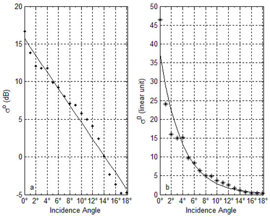 The linear fitting yields and . The NRCS and are expressed in dB and degrees, respectively. Near the nadir angle, the NRCS is very large and decreases drastically with small increments in incidence angle. Generally, the decrease in NRCS with increasing incidence angle obeys the simple Equation (3). This newly found phenomenon may be useful in the following research directions.