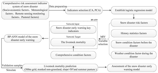 An early warning of snow disaster plays an important supporting role in disaster prevention and reduction in pastoral areas. With the development of high-resolution earth observation systems, simulations of snow disasters for early warning has improved from analysis of a single hazard event to comprehensive evaluations of various concurrent or connected disasters. This study analyzes the key factors that affect the risk assessment of snow disasters in Qinghai Province. A logistic regression method is used to construct a regression model of risk evaluation of snow disasters. The BP-ANN network, which is based on historical statistics, grassland husbandry information, snow remote sensing, and meteorological observations of 33 typical snow disaster cases, was trained to establish a snow disaster early warning model. The network has ideal predictive capability and generalization capacity to meet the requirements of snow disaster simulation for early warning.
