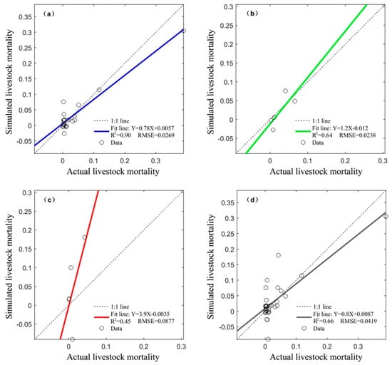 26] only considered two states: disaster or no disaster. Therefore, their accuracies are very qualitative, unlike this study, in which we use the livestock mortality, a quantitative assessment. In addition, in our model, the risk assessment factor (i.e., probability of a snow disaster occurrence) is one of the five key factors used for the simulation for an early warning. This, however, was not considered in these previous studies. The third improvement of our modeling is that our model is built totally on a grid (500 m in this case), unlike the previous studies that were only based on resolution at the county level. This greatly improves the resolution and accuracy of a snow disaster warning. In previous studies, one can only predict whether a county has a disaster or not, while in this study, we not only know which county has a disaster, but also know where it occurs and the degree of damage at the 500 m pixel scale.