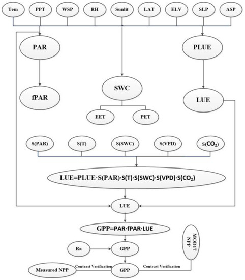 Meanwhile, the differences among water vapor pressure, PAR, air temperature, the concentration of CO2, and soil moisture are taken into account in the light efficiency model [28,29]. This approach can reflect the physiological and ecological processes of vegetation.