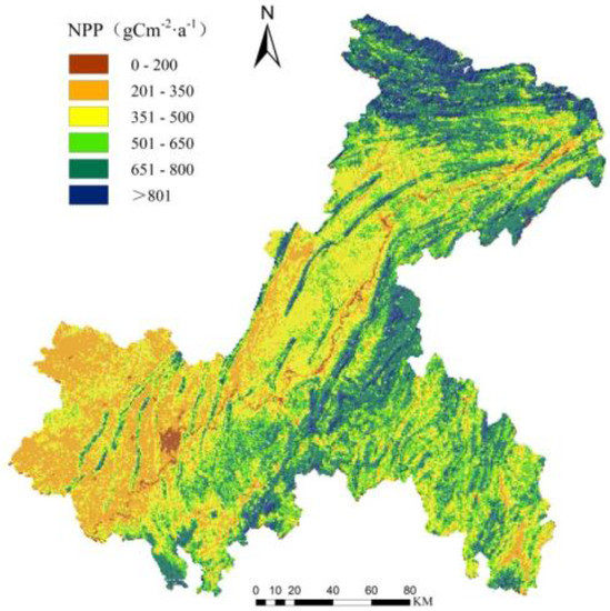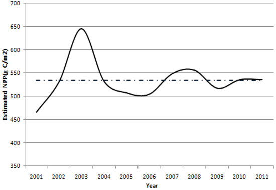Net primary productivity (NPP) is the net flux of carbon from the atmosphere into green plants per unit time. It is an essential flux of the net ecosystem exchange of CO2 between the atmosphere and terrestrial ecosystems. It is a key component of the carbon cycle [1] and an important indicator of the ecosystem [2]. Regional estimates of NPP are useful in modeling the regional and global carbon cycle. Quantitative estimates of NPP at regional to global scales are significant for understanding changes in ecosystem structure and function, predicting terrestrial carbon cycle trends [3,4,5], determining sustainable use of natural resources, and making policy decisions [6].
