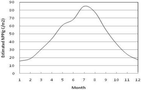 Three main methods have been used to estimate NPP for regional areas: (1) the establishment of a model that combined climatic and environmental factors, was established to evaluate the regional distribution of carbon budgets [7,8]; (2) the application of process-based, biogeochemical models that scale-up and extrapolate site-specific measurements [9,10]; and (3) models that use remote sensing data, numerous efforts have been made to develop various NPP models and to estimate global NPP. The accuracy of satellite-derived NPP estimates have been recently highlighted as a matter of concern because of poor satellite data quality and lack of accurate ecosystem representation in satellite-based models [11,12,13].