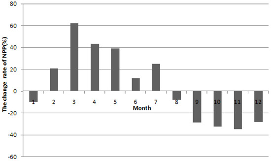 Calculated by the ratio between the months NPP difference for 11 years, the monthly rate change of NPP was obtained. From the change rate of monthly NPP (Figure 6), large variations occurred from March to May, and this period is the fastest growing period of NPP in Chongqing, with significant changes, whereas there is little change in the summer, and stability after September. Among the 11 years, the change rate of NPP in March reached 62.28%, while the lowest is 8.28% in August. This phenomenon indicates that NPP is stable in summer and the monthly variation of NPP in spring is larger, and the result may be caused by meteorological conditions in different seasons.