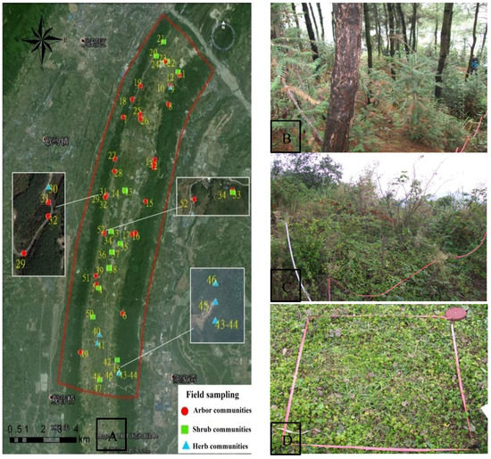 To validate the simulated NPP, two verification methods are used in the study: field observation, which is the most convincing method; and cross-validation between the relevant models, especially with the MODIS NPP product MOD17 correlation between the comparison. As we all know, measured NPP data for large areas are not available; however, vegetation productivity and biomass are strongly correlated with NPP [35]. To validate the simulated NPP, the relationship between aboveground biomass and NPP can be applied. Biomass was measured in the field at 52 plots in September 2013 (Figure 7A). Field surveys were conducted on arbors (Figure 7B), shrubs (Figure 7C), and herbs (Figure 7D), with 23 arbor samples, 21 shrub samples, and eight herb samples. The plots were divided into four 5 m × 5 m plots, and the two plots of the diagonal were selected to investigate the shrub layer. The herbaceous community randomly set a 1 m × 1 m small plot in the grassland for the herbal investigation. The latitude and longitude of the survey plots and environmental factors such as slope, slope direction, soil type, and vegetation restoration time were recorded. The position of each field sample is measured by GPS, and the pixels of vegetation in the sample are pure when it is selected, so that the sample of the verification point and the pixel on the remote sensing image correspond. The ratio of belowground NPP (BNPP) to aboveground NPP (ANPP) was calculated using the following equations.