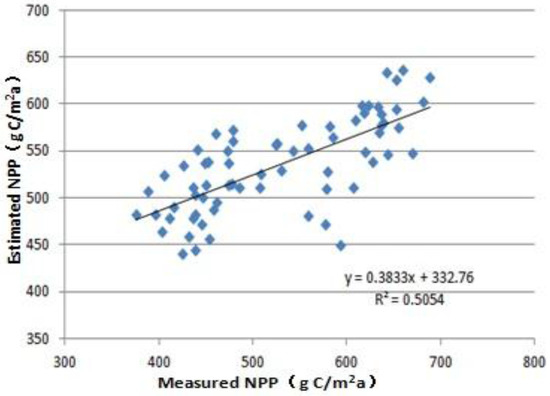 In a comparison with field data, the correlation between measured NPP and estimated NPP was 0.51 (Figure 8), thereby showing a significant linear relationship between measured NPP and simulated NPP (p < 0.01).