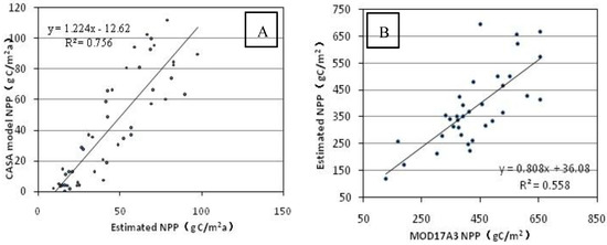 Comparison of NPP values among the estimated model, the CASA model (A) and MOD17 (B).