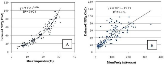 Relationships between estimated NPP and precipitation and temperature (A,B).
