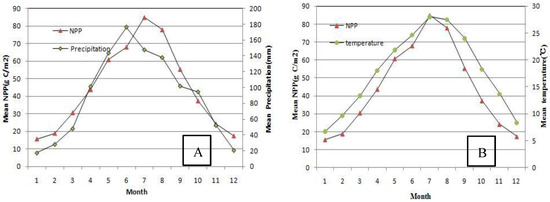 Monthly changes of estimated NPP and precipitation (A), temperature (B) (from 2001 to 2011).
