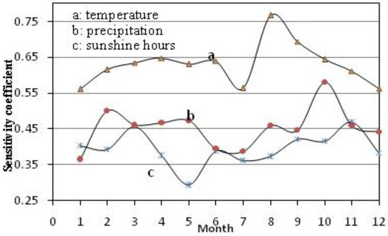 Sensitivity coefficient of precipitation, temperature, and sunshine hours (from 2001 to 2011).