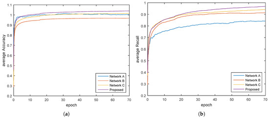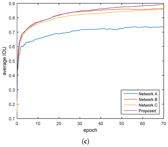 Training average Accuracy/epoch, Recall/epoch and IOU/epoch curve of networks with different multi-scale structure in Figure 5, with (a-c) labeled accordingly.