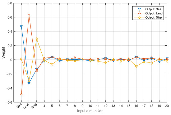First 20 weights of Layer fc_a2 plotted as lines. Each line represents the weights corresponding to a specific output category (sea, land and ship) as listed in the legend. Each dot on the line represent a weight corresponding to an input dimension. The first 3 input dimensions corresponds to coarse-scale score slices of sea, land and ship, respectively, and the other dimensions corresponds to feature maps from fine-scale Layer fc_a1.